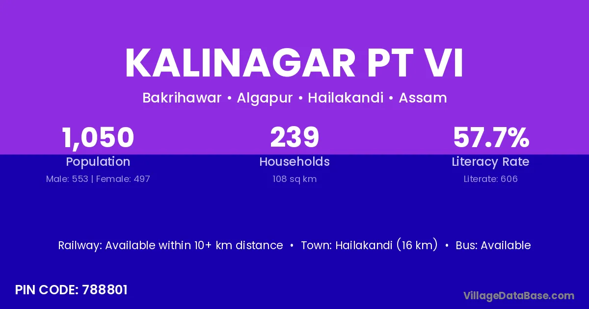 Hailakandi (16 km) is the nearest town to Kalinagar Pt Vi village for major economic activities and is located approximately 16 km away.