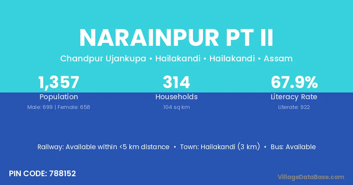 Hailakandi (14 km) is the nearest town to Narainpur Pt Ii village for major economic activities and is located approximately 14 km away.