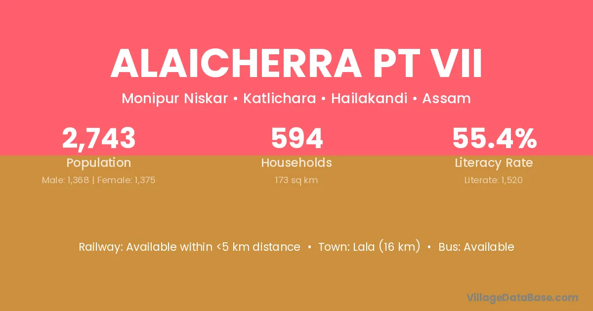 Lala (16 km) is the nearest town to Alaicherra Pt Vii village for major economic activities and is located approximately 16 km away.