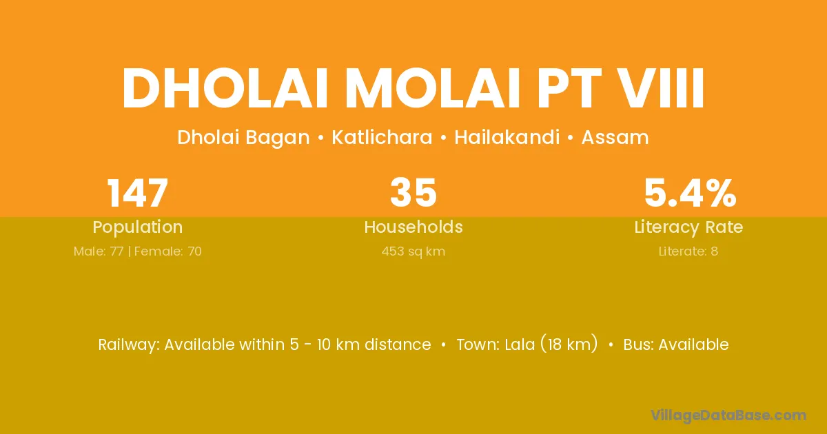 Dholai Molai Pt Viii village has a total population of 147 people, of which 77 are males and 70 are females.