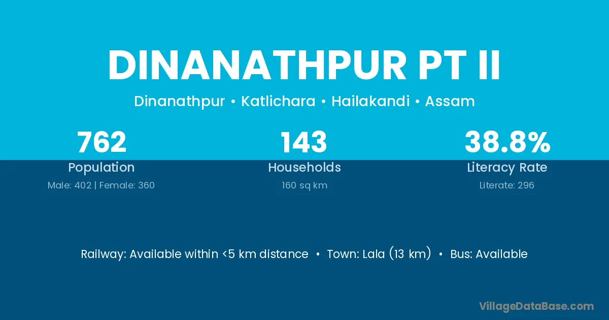 Dinanathpur Pt Ii village has a total population of 762 people, of which 402 are males and 360 are females.