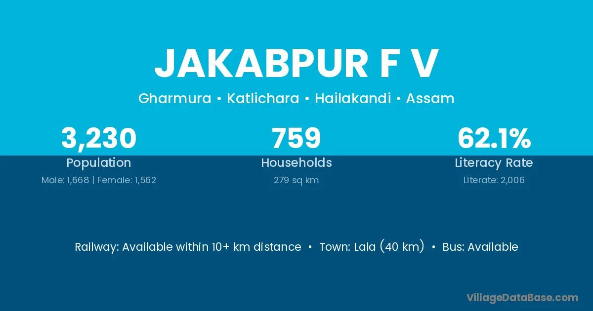 Lala (40 km) is the nearest town to Jakabpur F V village for major economic activities and is located approximately 40 km away.