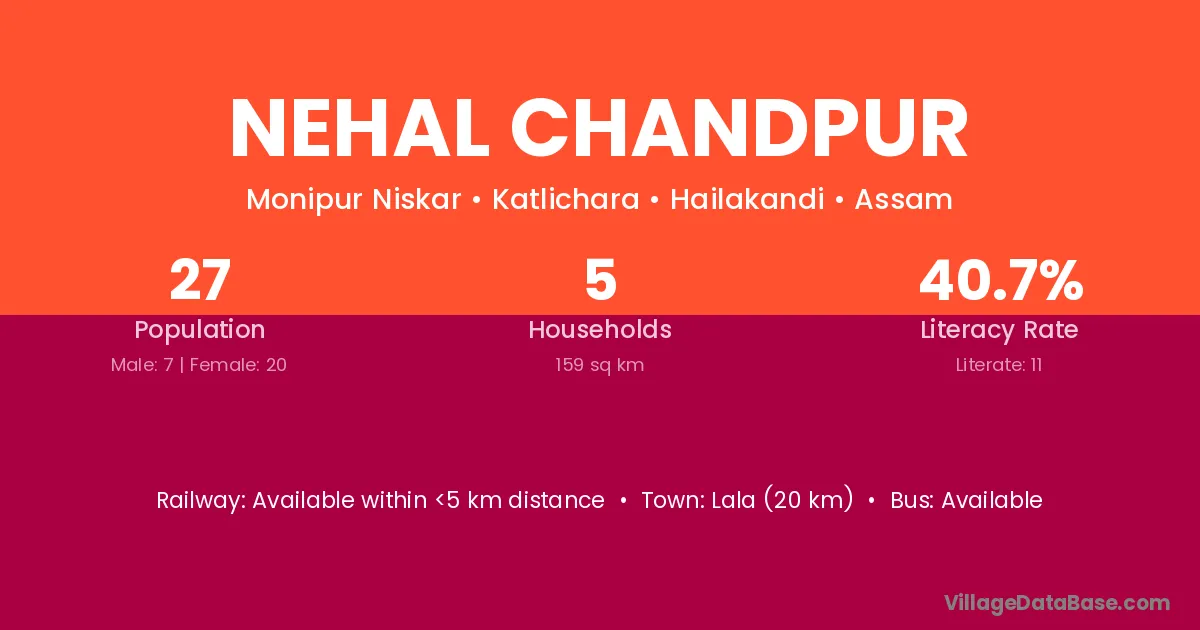Lala (20 km) is the nearest town to Nehal Chandpur village for major economic activities and is located approximately 20 km away.