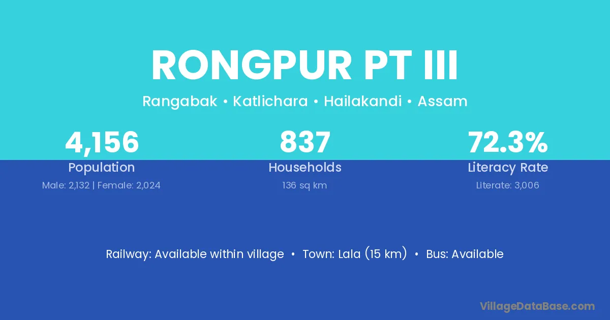 Lala (15 km) is the nearest town to Rongpur Pt Iii village for major economic activities and is located approximately 15 km away.