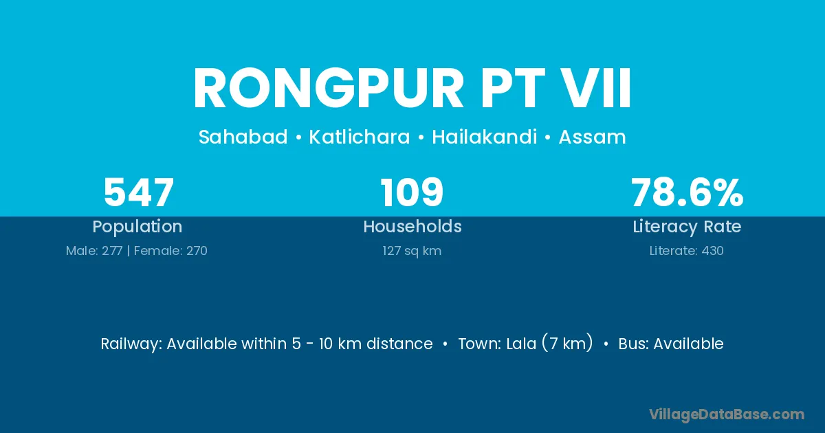 Lala (7 km) is the nearest town to Rongpur Pt Vii village for major economic activities and is located approximately 7 km away.
