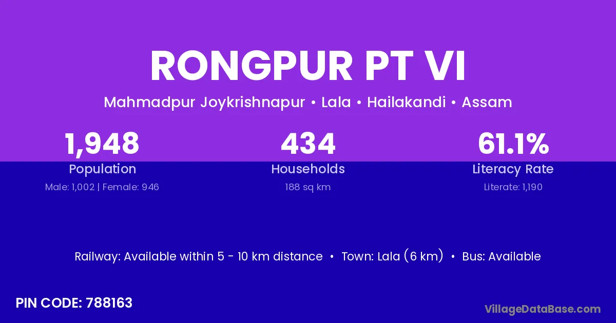 Rongpur Pt Vi village has a total population of 1,948 people, of which 1,002 are males and 946 are females.