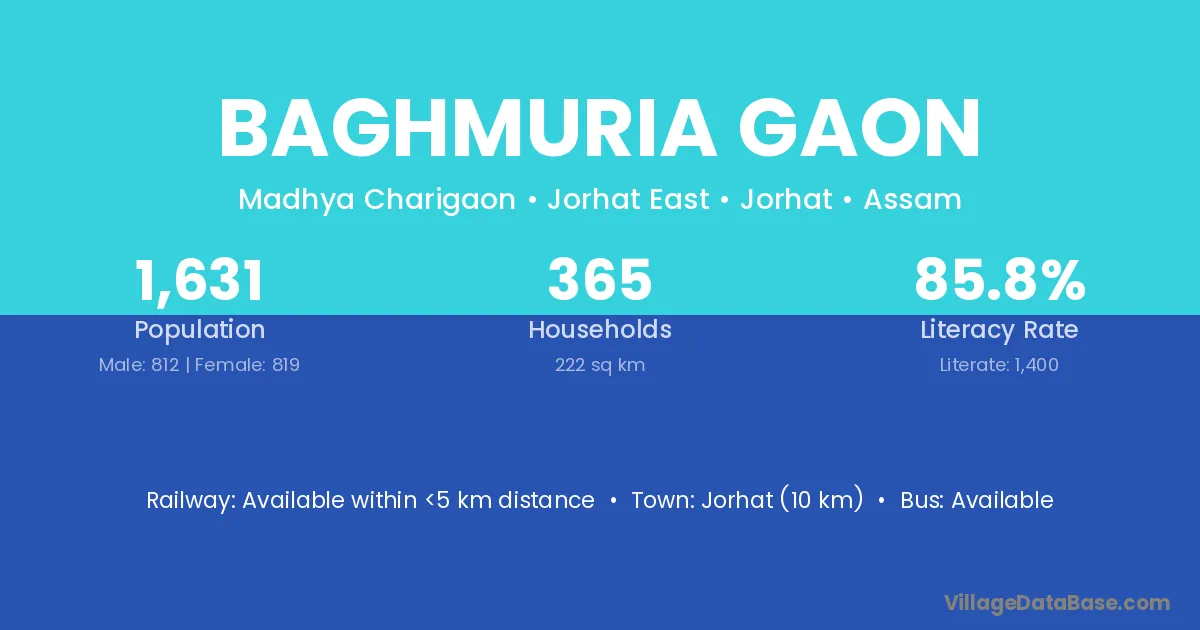 Baghmuria Gaon village has a total population of 1,631 people, of which 812 are males and 819 are females.