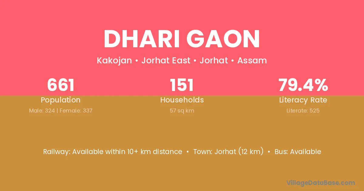 Dhari Gaon village has a total population of 661 people, of which 324 are males and 337 are females.