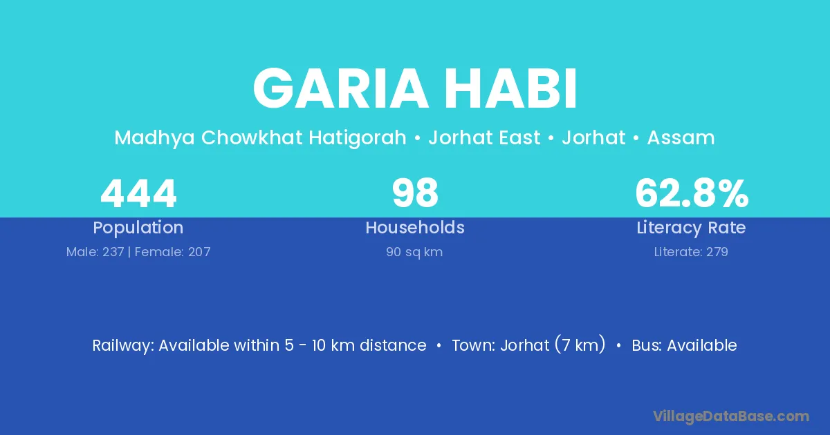Jorhat (7 km) is the nearest town to Garia Habi village for major economic activities and is located approximately 7 km away.