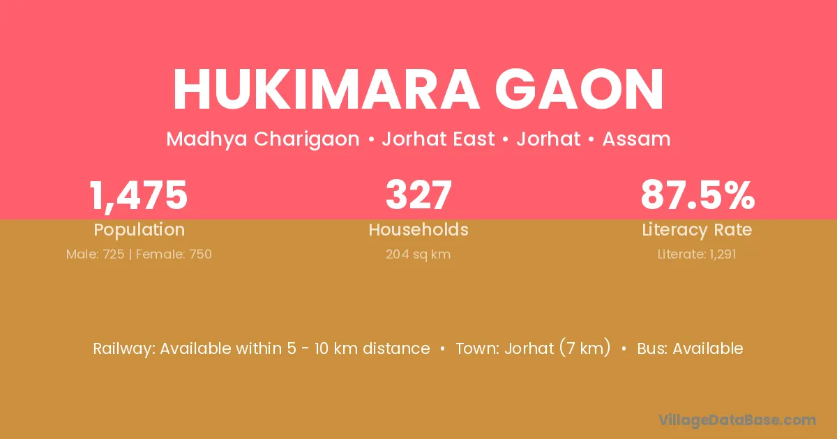 Jorhat (7 km) is the nearest town to Hukimara Gaon village for major economic activities and is located approximately 7 km away.