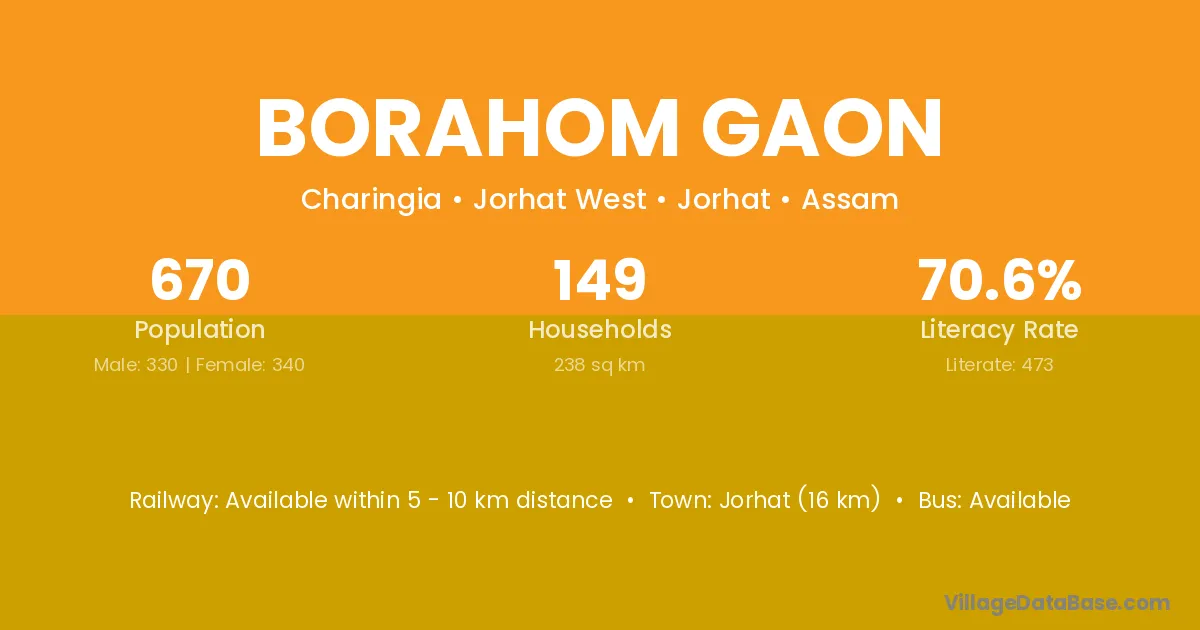 Jorhat (16 km) is the nearest town to Borahom Gaon village for major economic activities and is located approximately 16 km away.