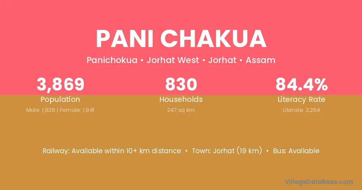 Jorhat (19 km) is the nearest town to Pani Chakua village for major economic activities and is located approximately 19 km away.