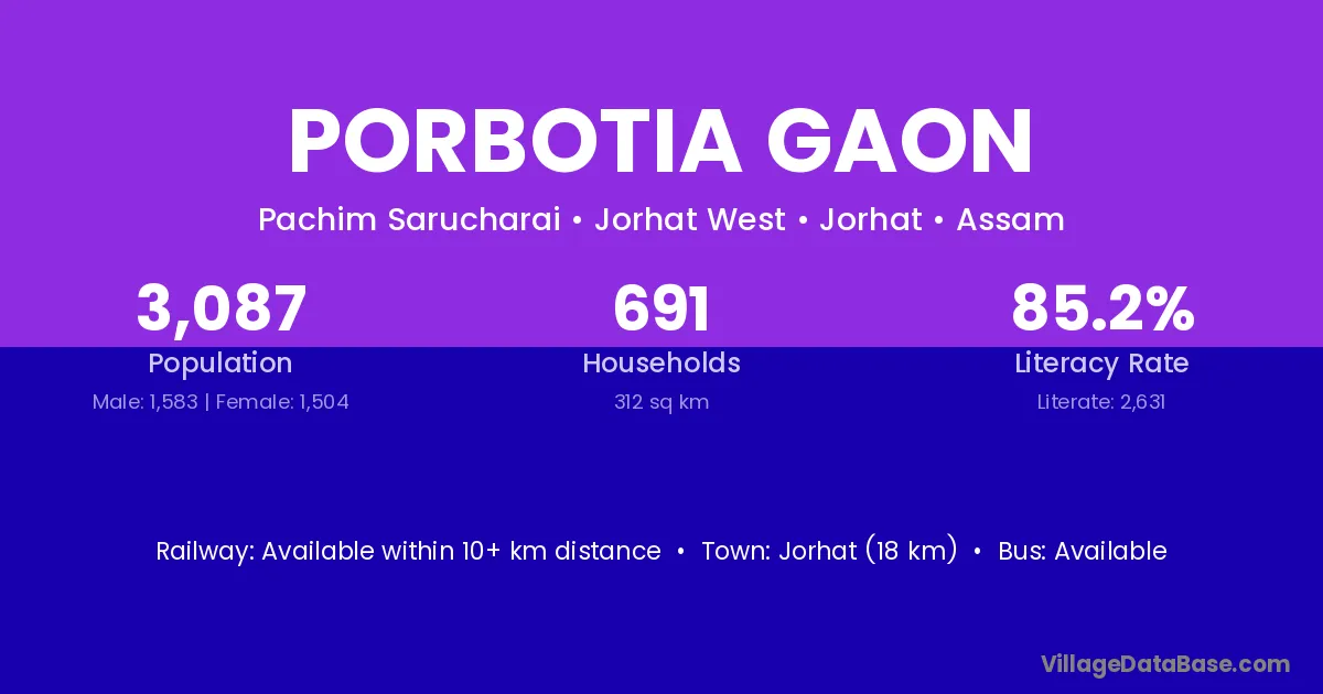 Jorhat (18 km) is the nearest town to Porbotia Gaon village for major economic activities and is located approximately 18 km away.