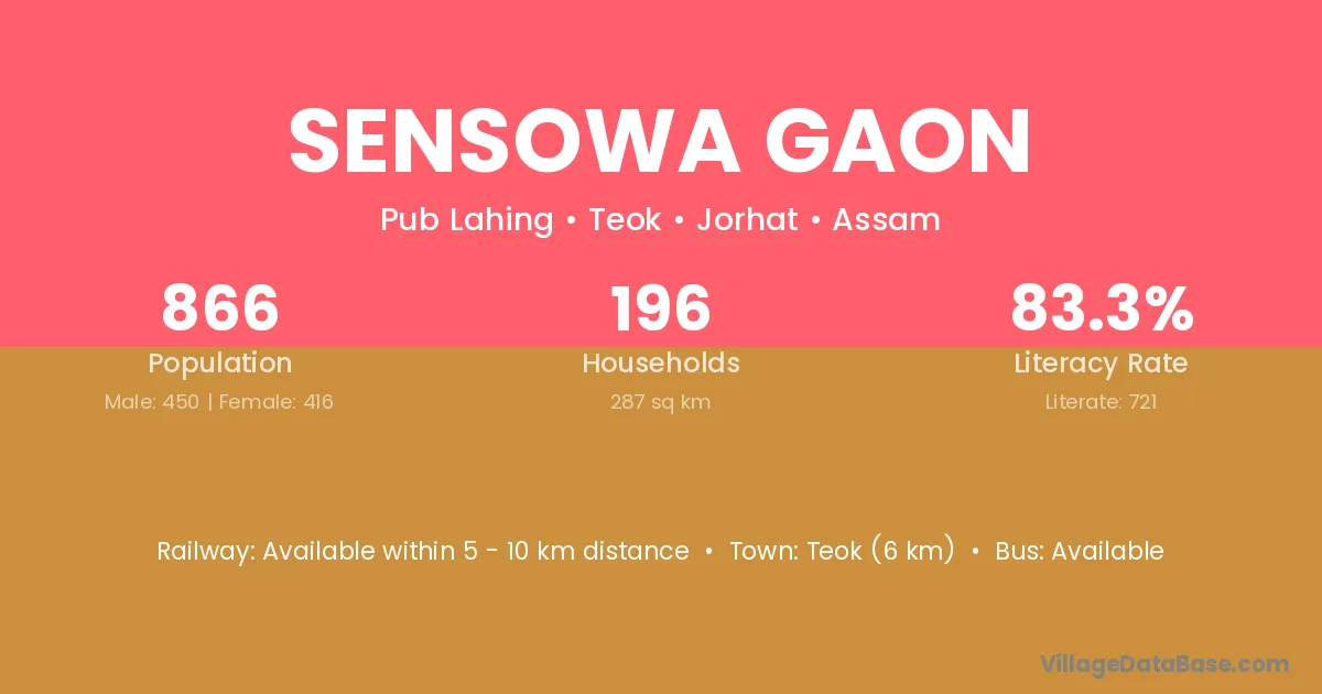 Jorhat (13 km) is the nearest town to Sensowa Gaon village for major economic activities and is located approximately 13 km away.