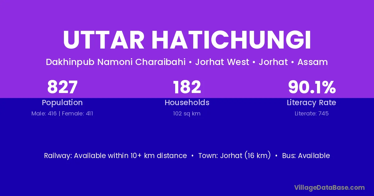 Jorhat (16 km) is the nearest town to Uttar Hatichungi village for major economic activities and is located approximately 16 km away.