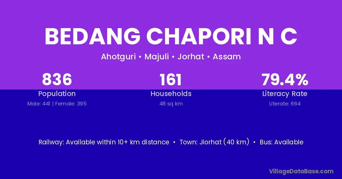 Bedang Chapori N C village has a total population of 836 people, of which 441 are males and 395 are females.