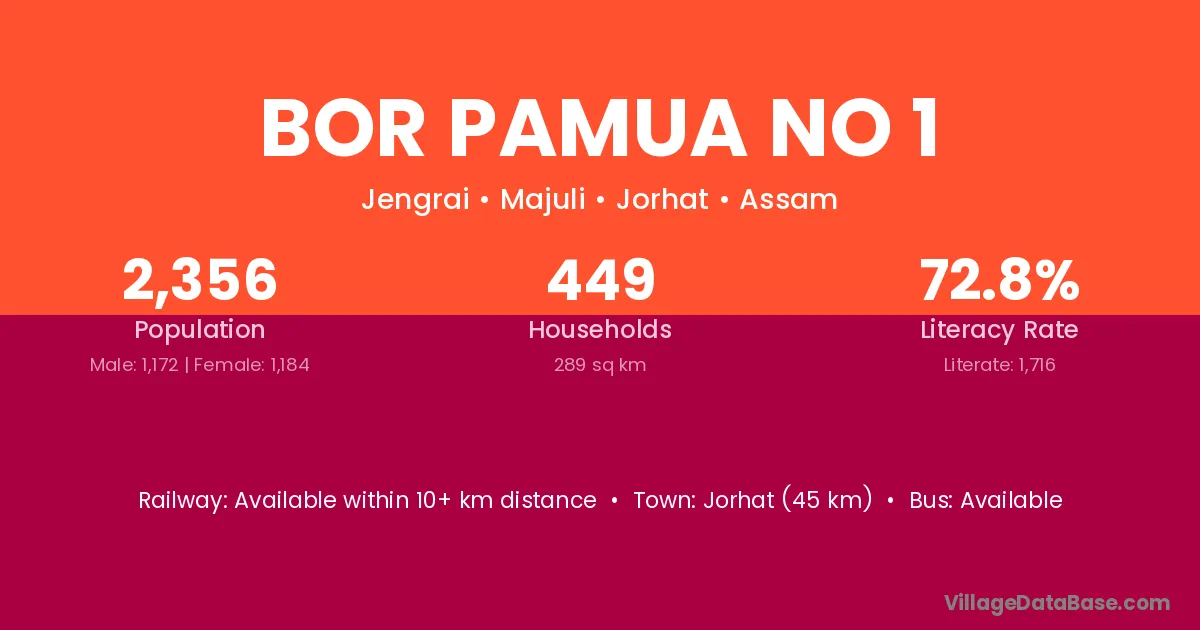 Jorhat (45 km) is the nearest town to Bor Pamua No 1 village for major economic activities and is located approximately 45 km away.