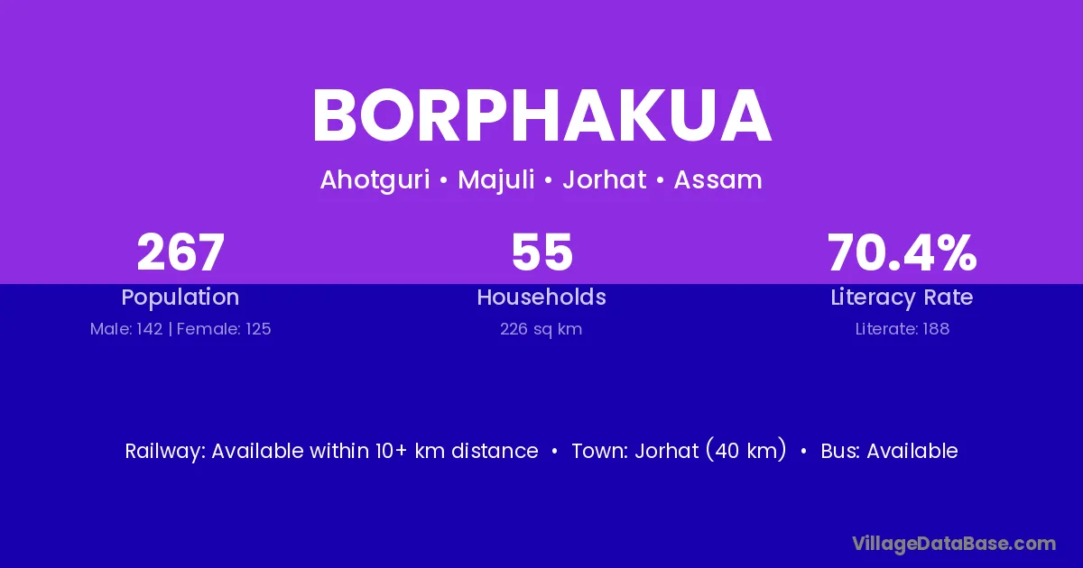 Jorhat (40 km) is the nearest town to Borphakua village for major economic activities and is located approximately 40 km away.
