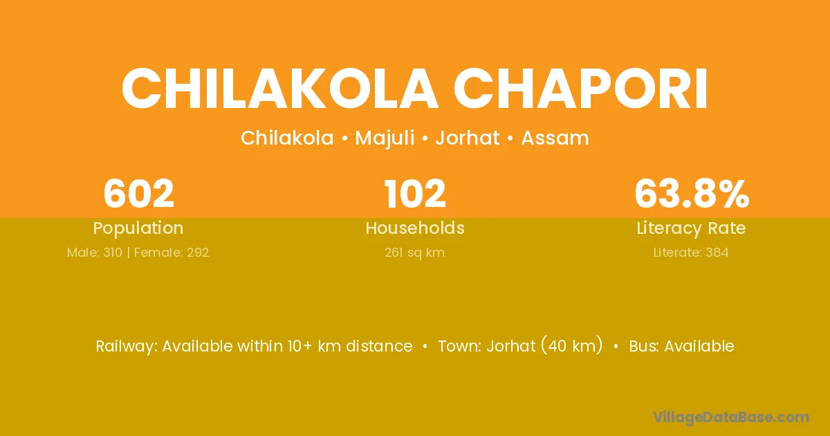 Jorhat (40 km) is the nearest town to Chilakola Chapori village for major economic activities and is located approximately 40 km away.