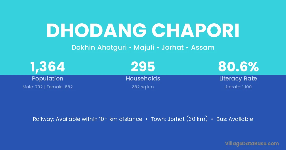 Jorhat (30 km) is the nearest town to Dhodang Chapori village for major economic activities and is located approximately 30 km away.