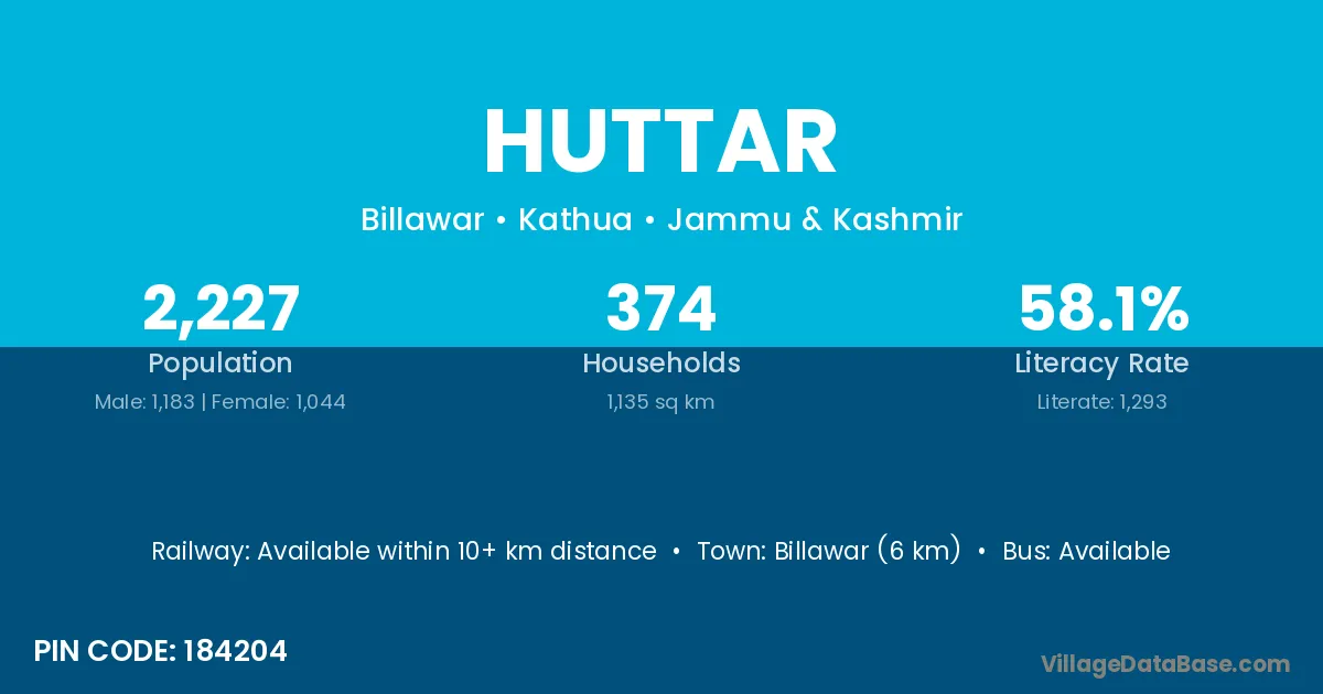 The literacy rate of Huttar village is 69.07%. Male literacy stands at 80.88% and female literacy at 55.56%.