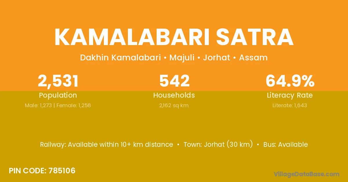 Kamalabari Satra village has a total population of 2,531 people, of which 1,273 are males and 1,258 are females.