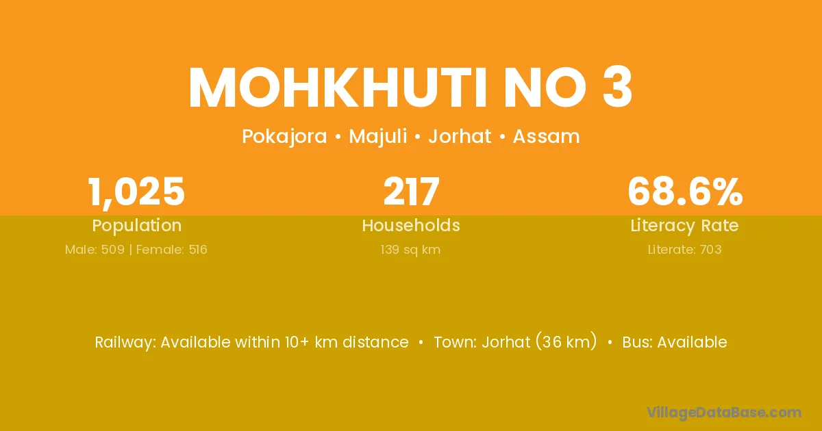 Jorhat (36 km) is the nearest town to Mohkhuti No 3 village for major economic activities and is located approximately 36 km away.