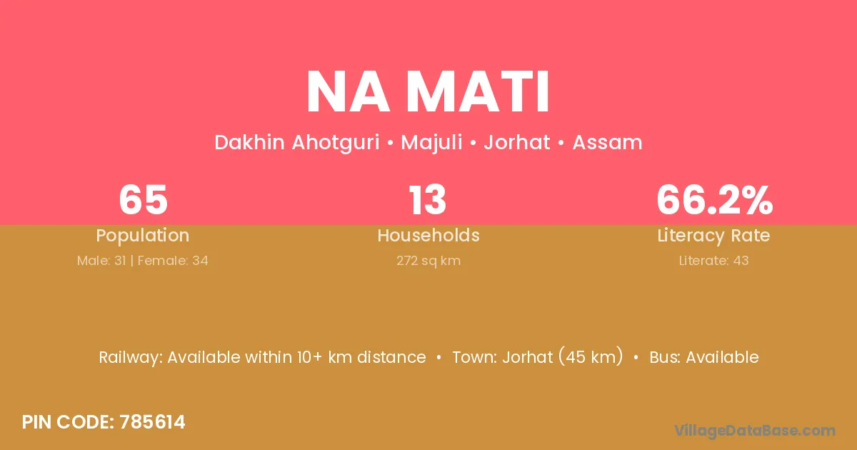 Jorhat (45 km) is the nearest town to Na Mati village for major economic activities and is located approximately 45 km away.