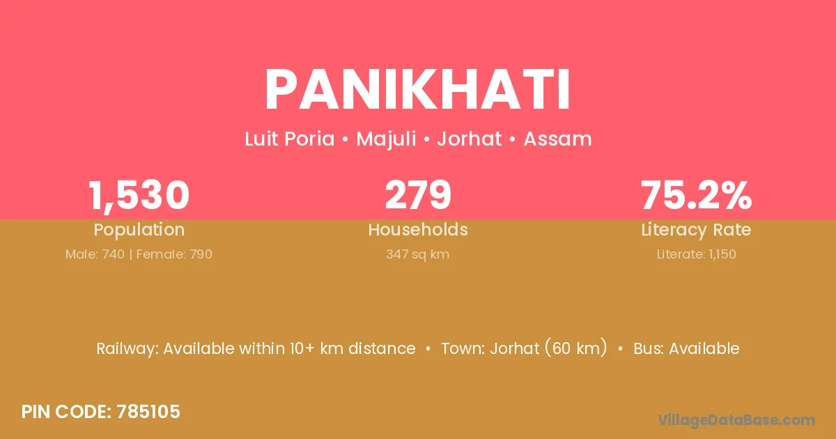 Jorhat (60 km) is the nearest town to Panikhati village for major economic activities and is located approximately 60 km away.