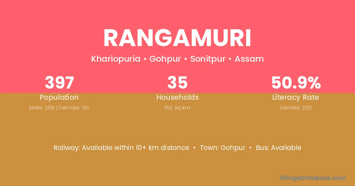 Jorhat (45 km) is the nearest town to Rangamuri village for major economic activities and is located approximately 45 km away.