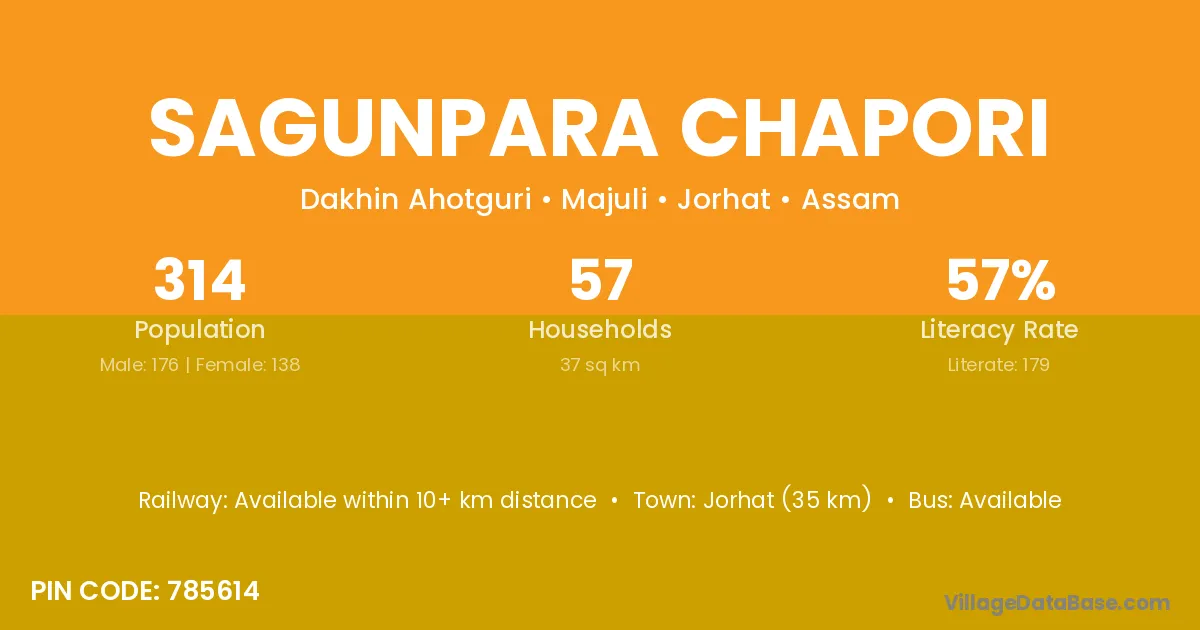 Sagunpara Chapori village has a total population of 314 people, of which 176 are males and 138 are females.