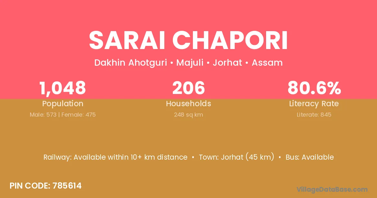 Jorhat (45 km) is the nearest town to Sarai Chapori village for major economic activities and is located approximately 45 km away.
