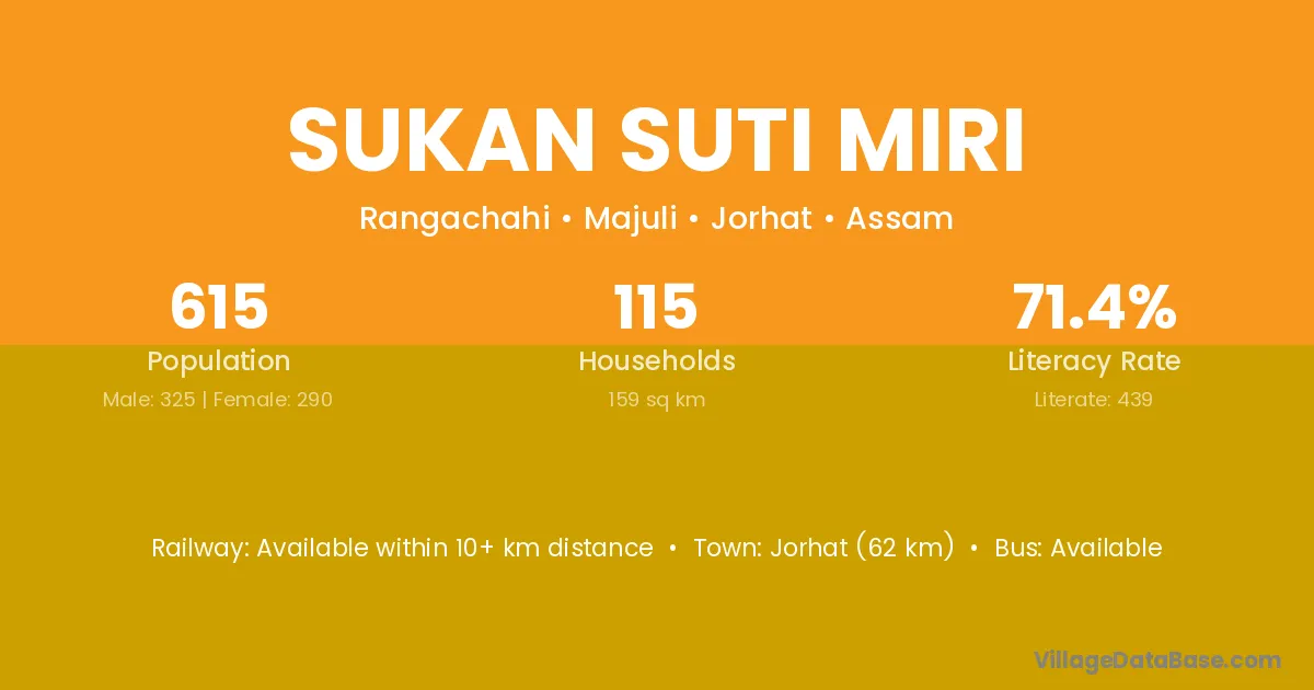 Jorhat (62 km) is the nearest town to Sukan Suti Miri village for major economic activities and is located approximately 62 km away.