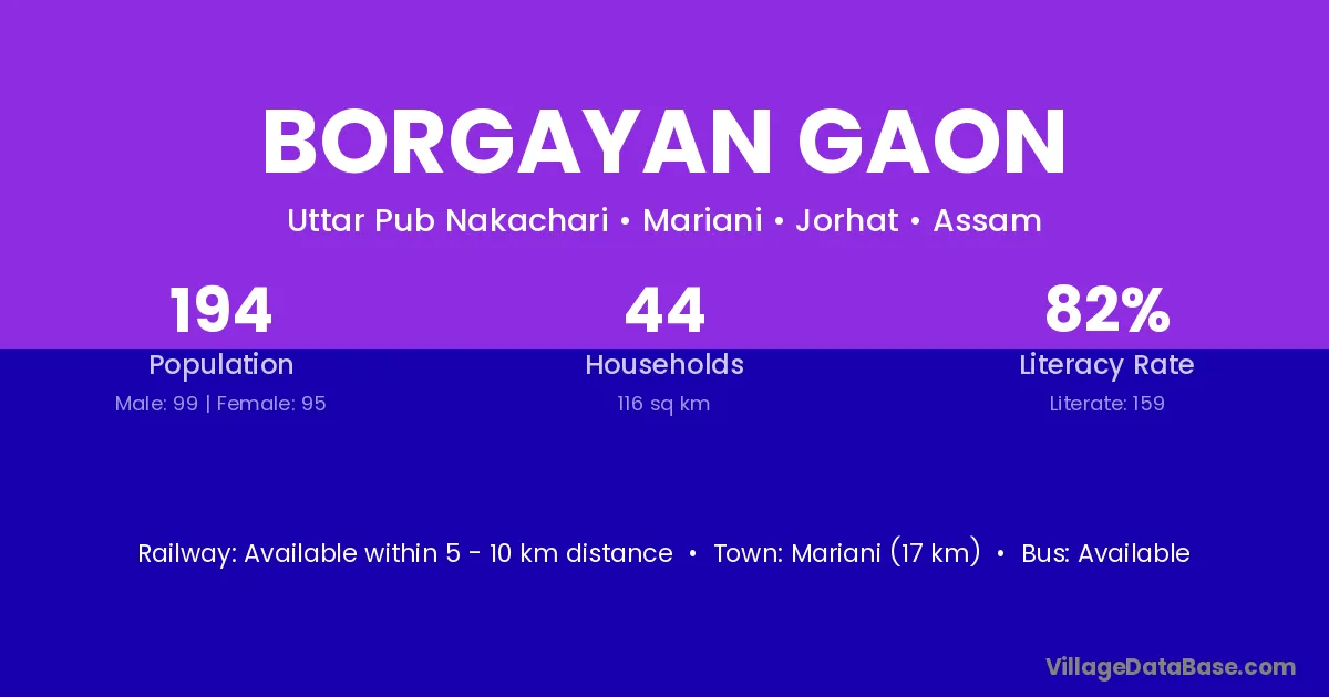 Borgayan Gaon village has a total population of 194 people, of which 99 are males and 95 are females.