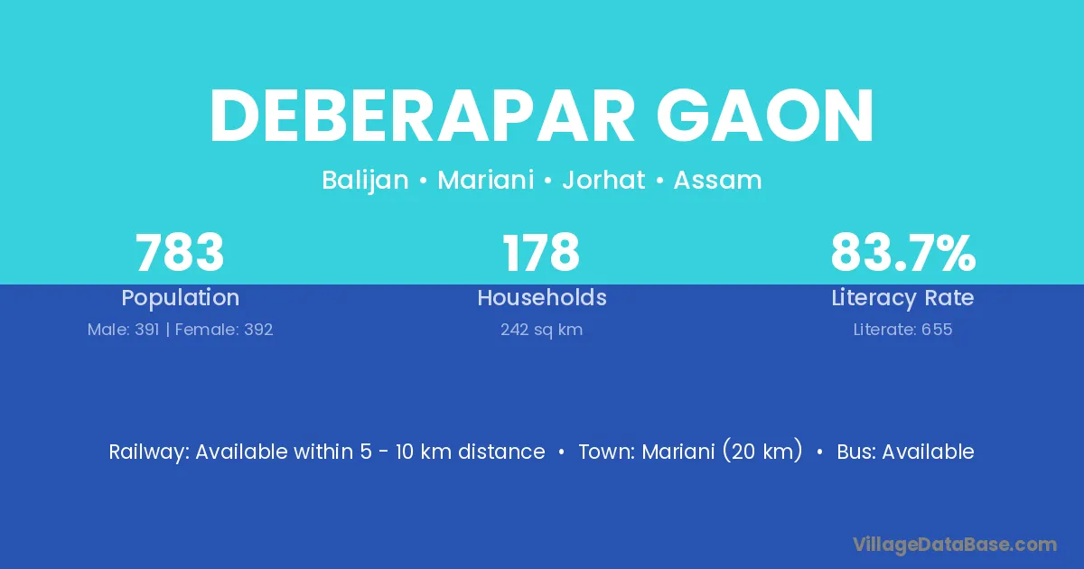 Mariani (20 km) is the nearest town to Deberapar Gaon village for major economic activities and is located approximately 20 km away.