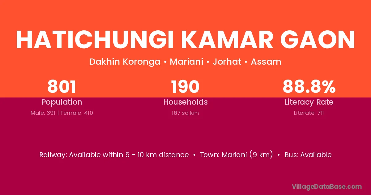 Mariani (9 km) is the nearest town to Hatichungi Kamar Gaon village for major economic activities and is located approximately 9 km away.