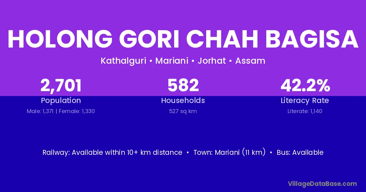 Mariani (11 km) is the nearest town to Holong Gori Chah Bagisa village for major economic activities and is located approximately 11 km away.