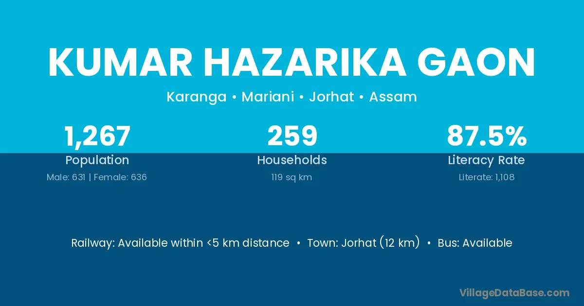 Kumar Hazarika Gaon village has a total population of 1,267 people, of which 631 are males and 636 are females.