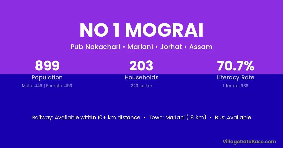 No 1 Mograi village has a total population of 899 people, of which 446 are males and 453 are females.