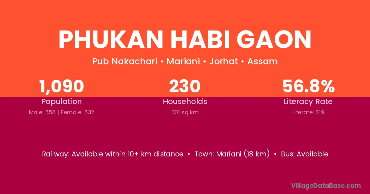 Phukan Habi Gaon village has a total population of 1,090 people, of which 558 are males and 532 are females.