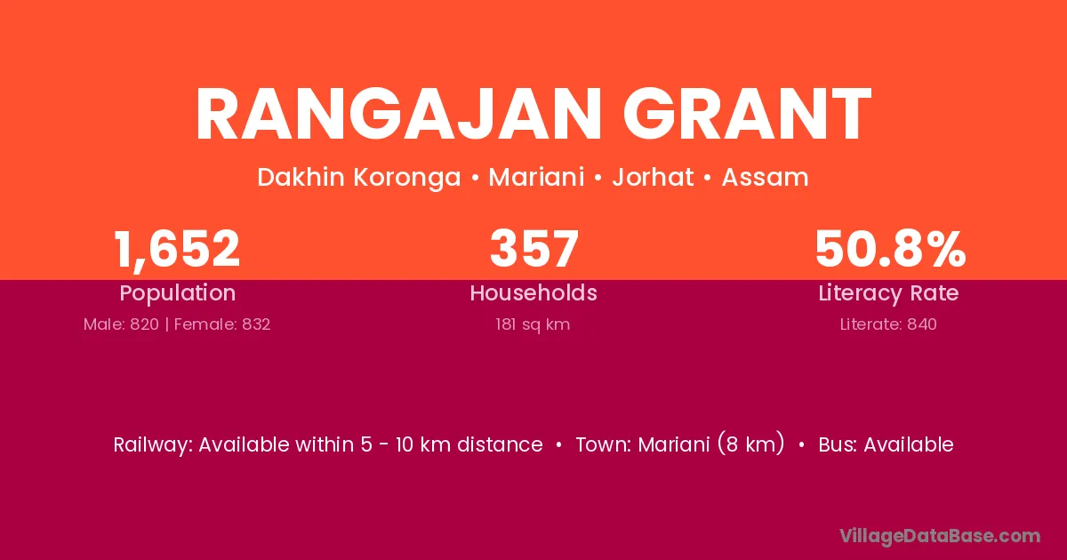 Mariani (8 km) is the nearest town to Rangajan Grant village for major economic activities and is located approximately 8 km away.