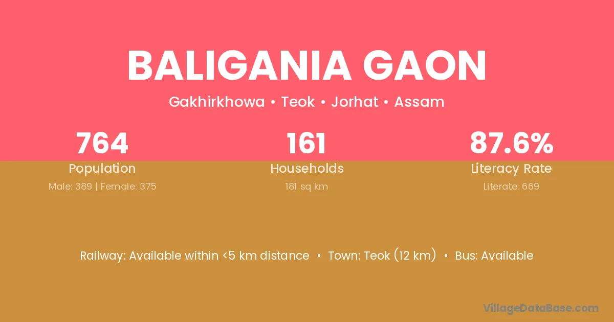 Teok (12 km) is the nearest town to Baligania Gaon village for major economic activities and is located approximately 12 km away.