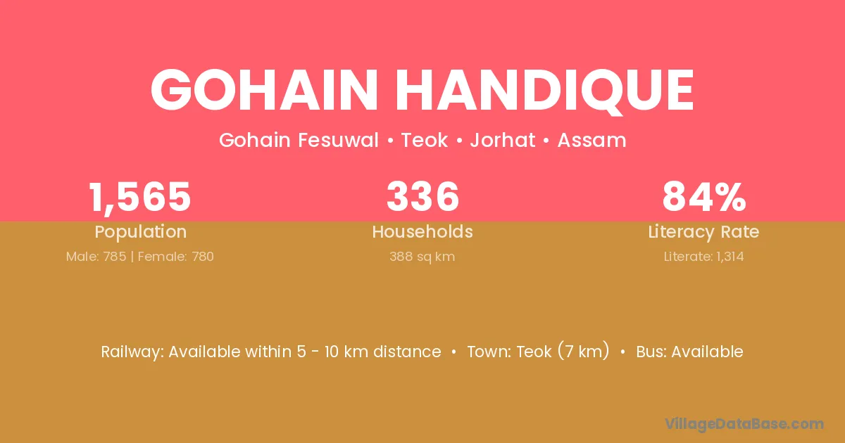 Gohain Handique village has a total population of 1,565 people, of which 785 are males and 780 are females.