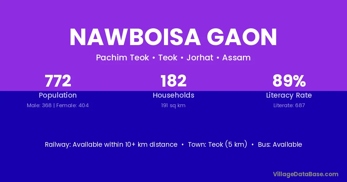 Nawboisa Gaon village has a total population of 772 people, of which 368 are males and 404 are females.