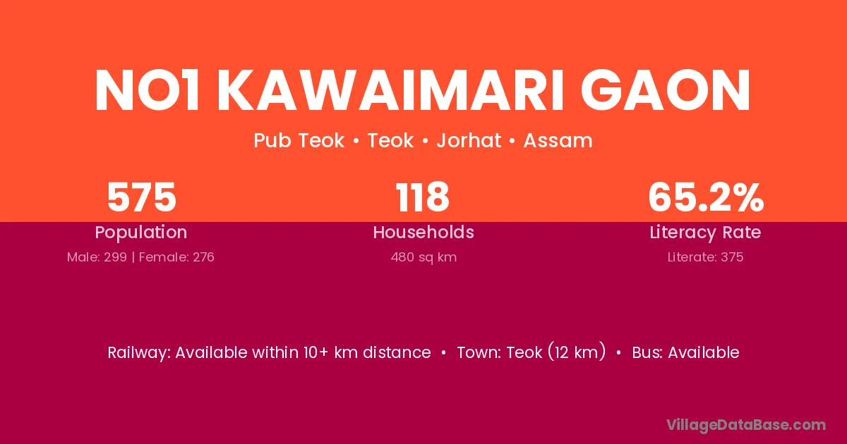 No1 Kawaimari Gaon village has a total population of 575 people, of which 299 are males and 276 are females.