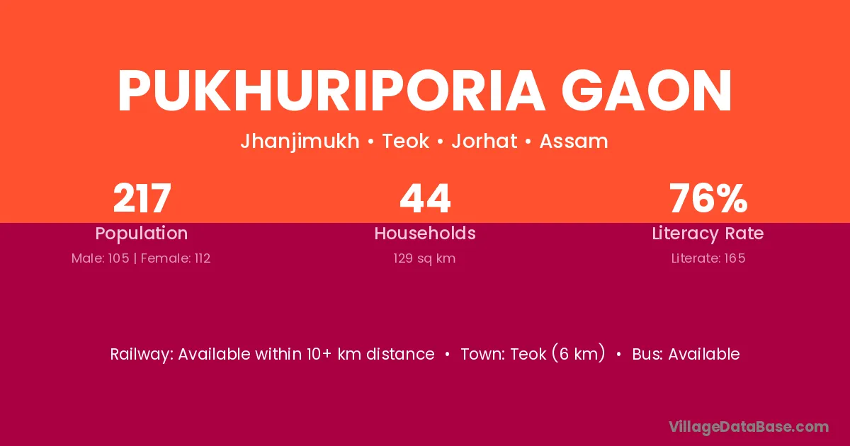Pukhuriporia Gaon village has a total population of 217 people, of which 105 are males and 112 are females.