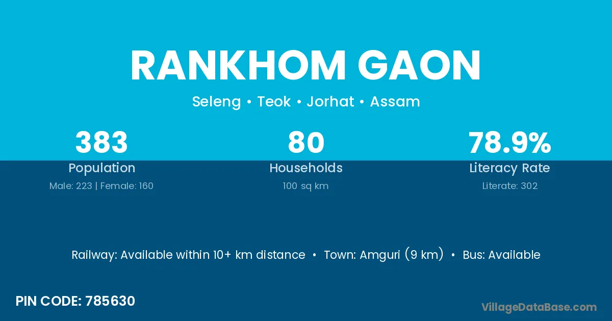 Amguri (9 km) is the nearest town to Rankhom Gaon village for major economic activities and is located approximately 9 km away.