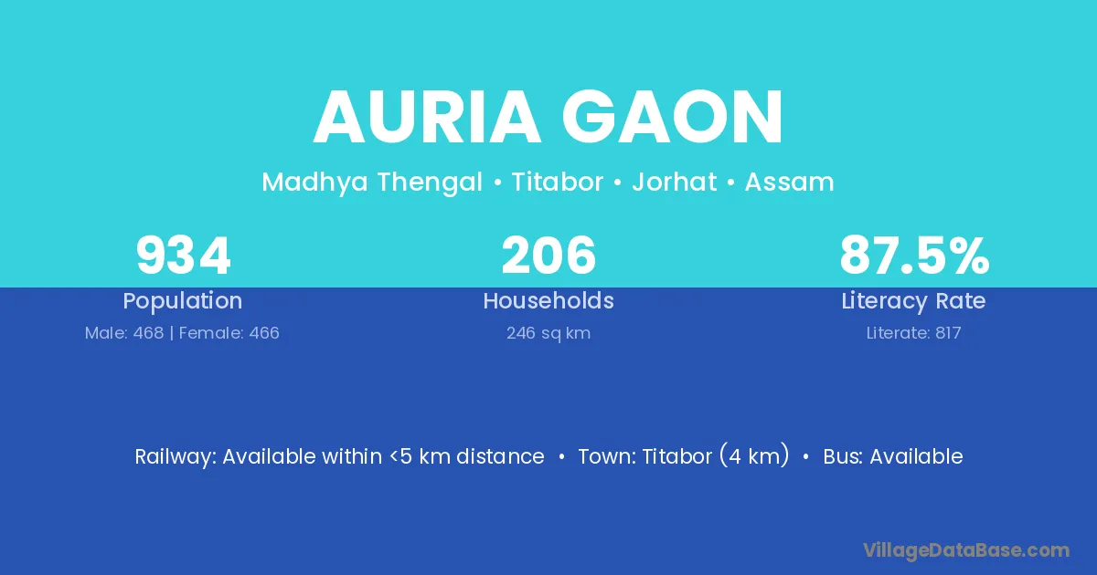 Titabor (4 km) is the nearest town to Auria Gaon village for major economic activities and is located approximately 4 km away.