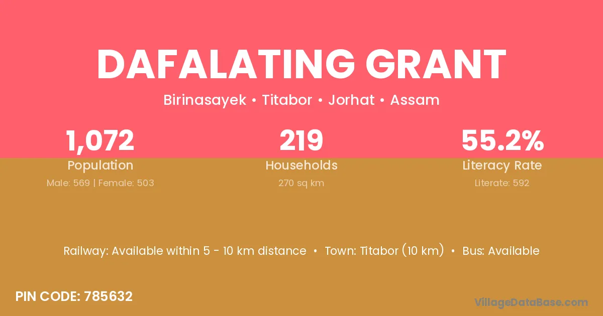 Titabor (10 km) is the nearest town to Dafalating Grant village for major economic activities and is located approximately 10 km away.