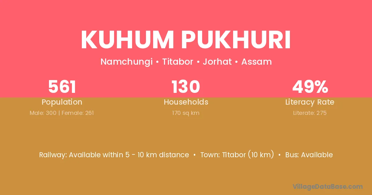 Kuhum Pukhuri village has a total population of 561 people, of which 300 are males and 261 are females.